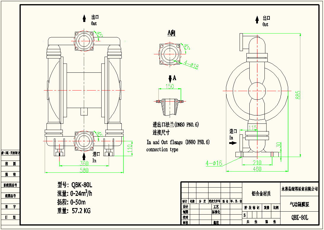 泵體(兩邊立柱,進(jìn)出口管)采用優(yōu)質(zhì)鋁合金,配丁腈橡膠(NBR)材質(zhì)密封球、密封球座,丁腈橡膠(NBR)隔膜片,可適用于輸送污水,油類等無強腐蝕類介質(zhì)。